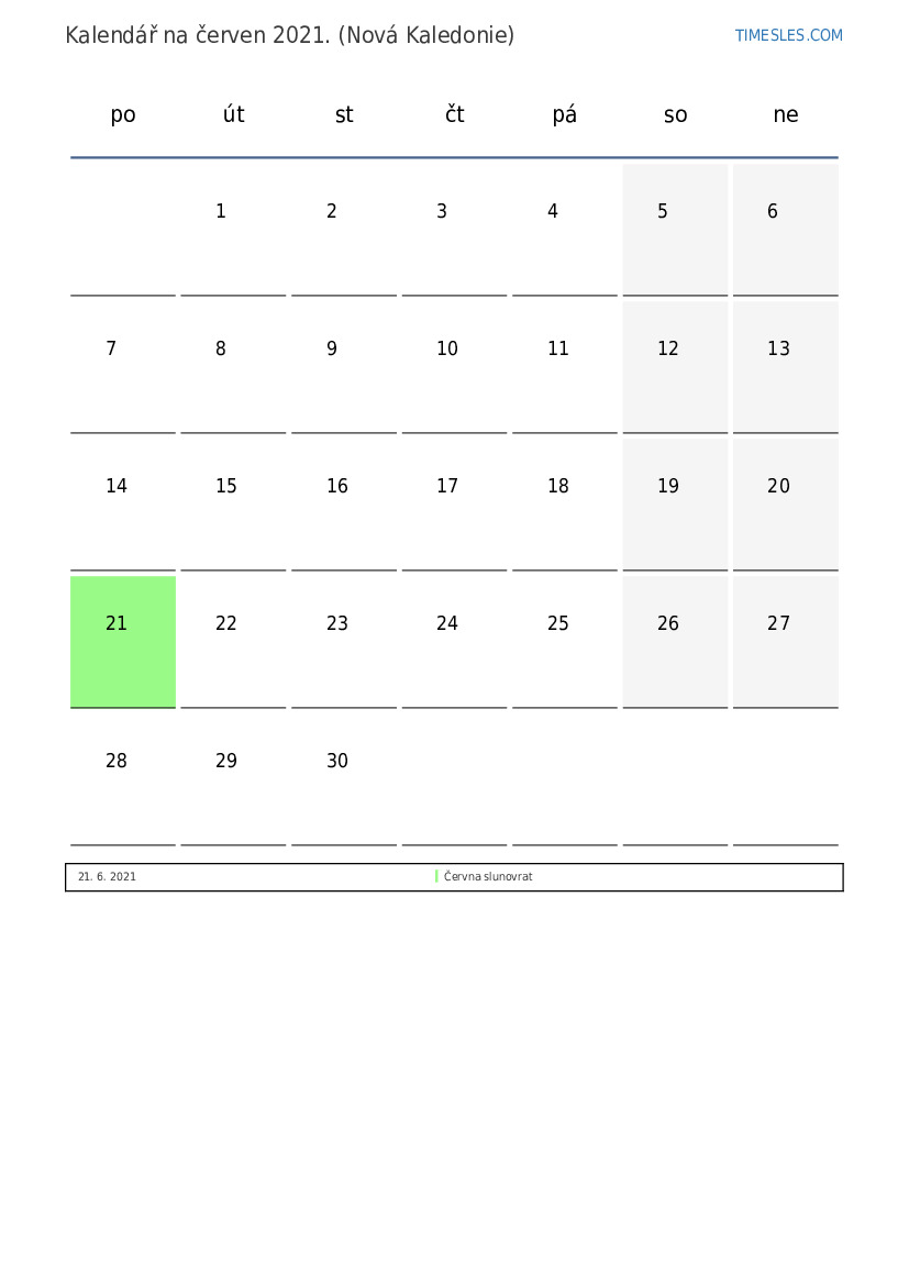 červen 2021 kalendář pro Novou Kaledonii
