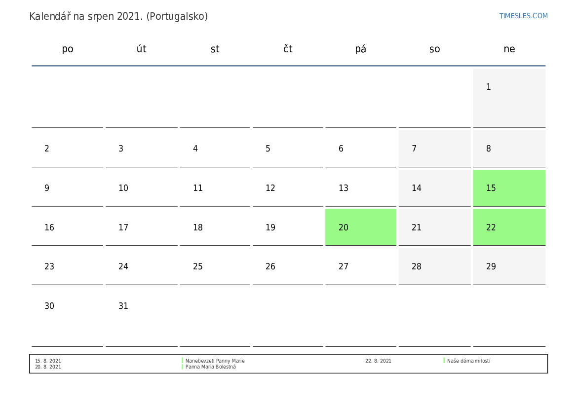 Stáhněte si a vytiskněte si kalendář PDF se svátky a víkendy na srpen 2021 pro Portugalsko