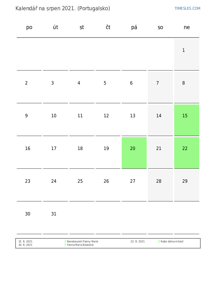 Kalendář svátků a víkendů na srpen 2021 pro Portugalsko
