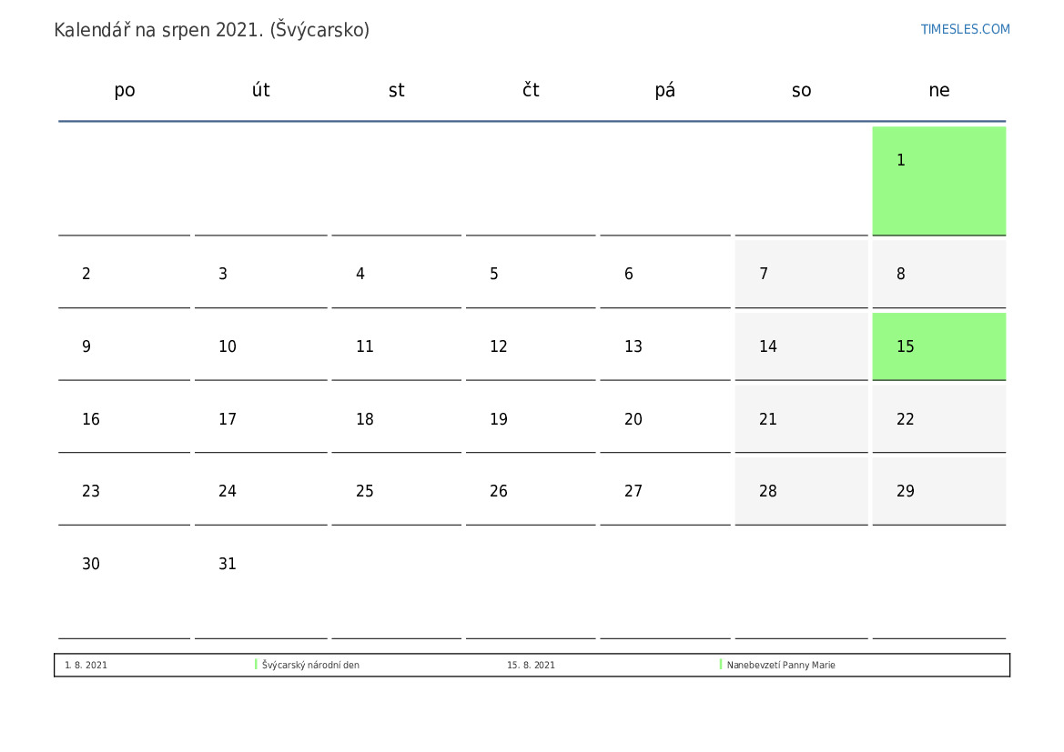 Stáhněte si a vytiskněte si kalendář PDF se svátky a víkendy na srpen 2021 pro Švýcarsko