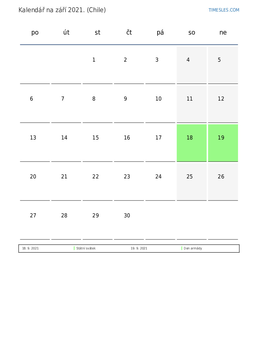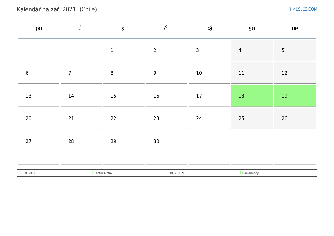 Stáhněte si a vytiskněte si kalendář PDF se svátky a víkendy na září 2021 pro Chile