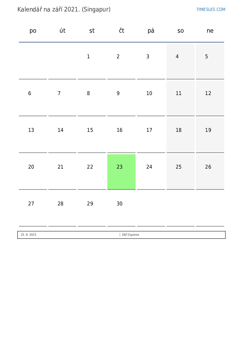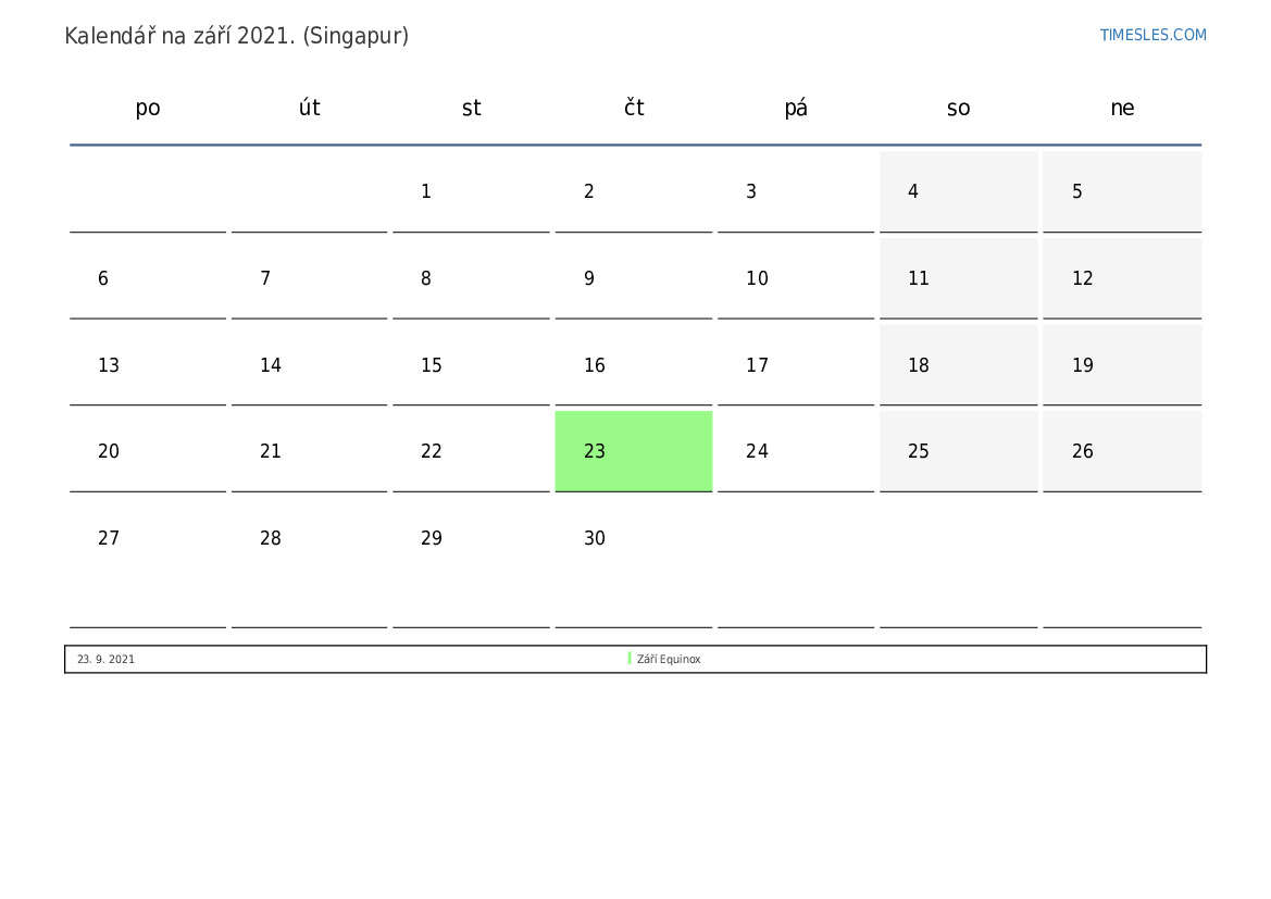 Měsíc září obsahuje 30 dní. Toto je 9 měsíc roku 2021. Sezóna roku: podzim. Měsíc září začíná ve středu a končí ve čtvrtek. V měsíci září 2021 je v Singapuru 1 svátek a den volna.