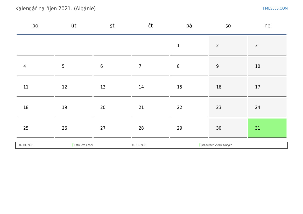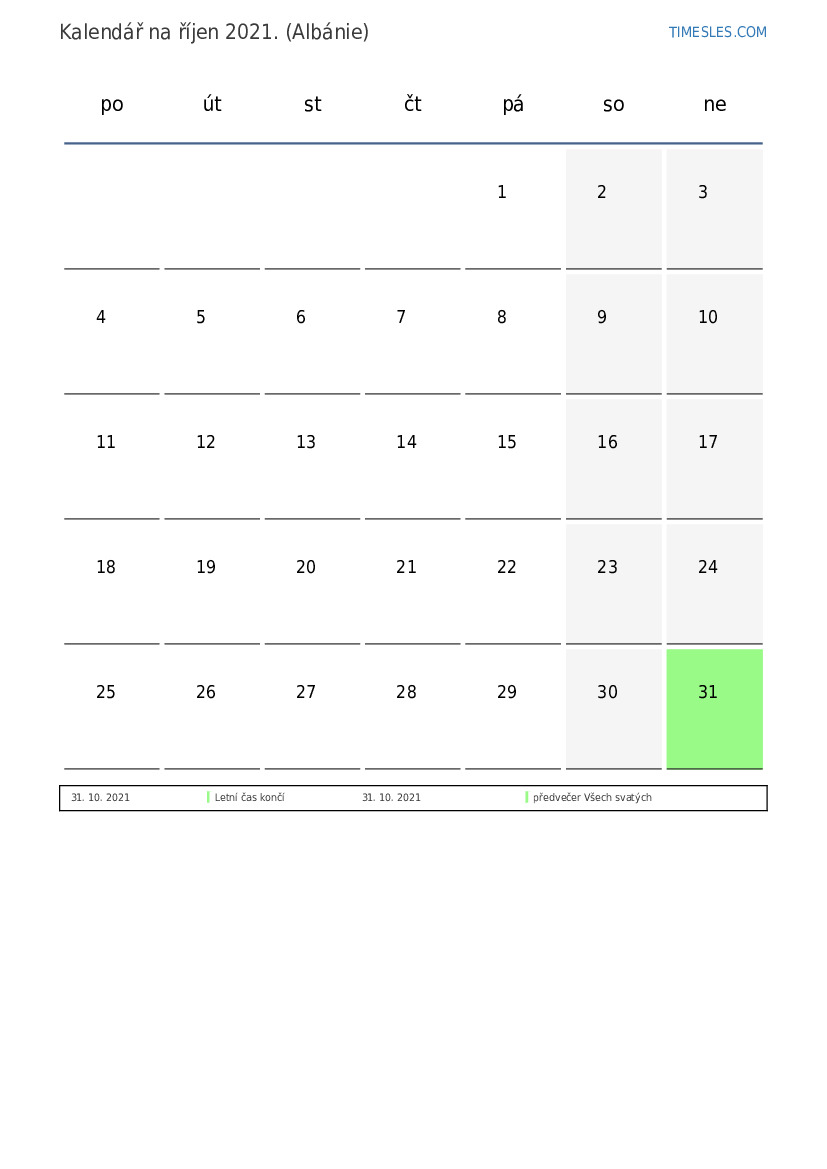 Stáhněte si a vytiskněte si kalendář PDF se svátky a víkendy na říjen 2021 pro Albánii
