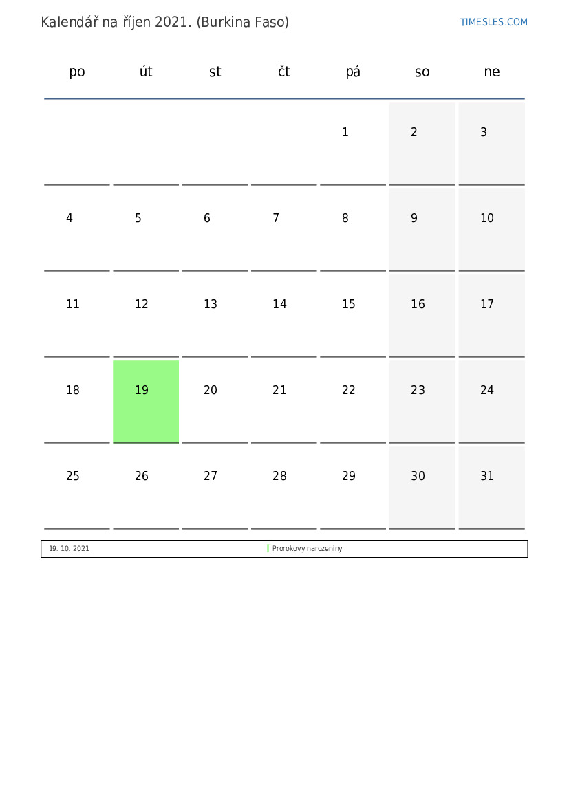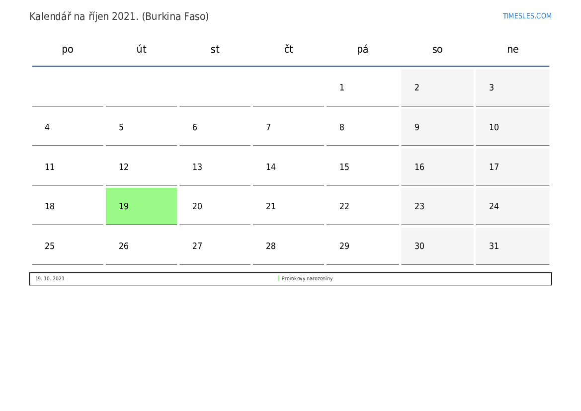 Stáhněte si a vytiskněte si kalendář PDF se svátky a víkendy na říjen 2021 pro Burkinu Faso