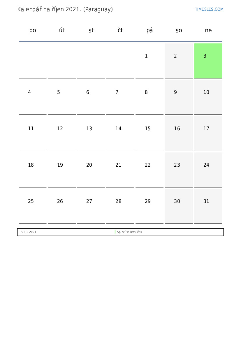 Stáhněte si a vytiskněte si kalendář PDF se svátky a víkendy na říjen 2021 pro Paraguay