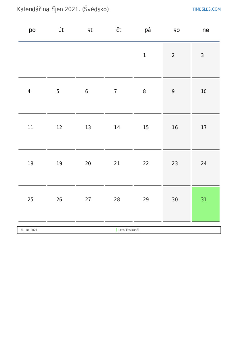 Měsíc říjen obsahuje 31 dnů. Toto je 10 měsíc roku 2021. Sezóna roku: podzim. Měsíc říjen začíná v pátek a končí v neděli. V měsíci říjen 2021 je ve Švédsku 1 svátek a den volna.