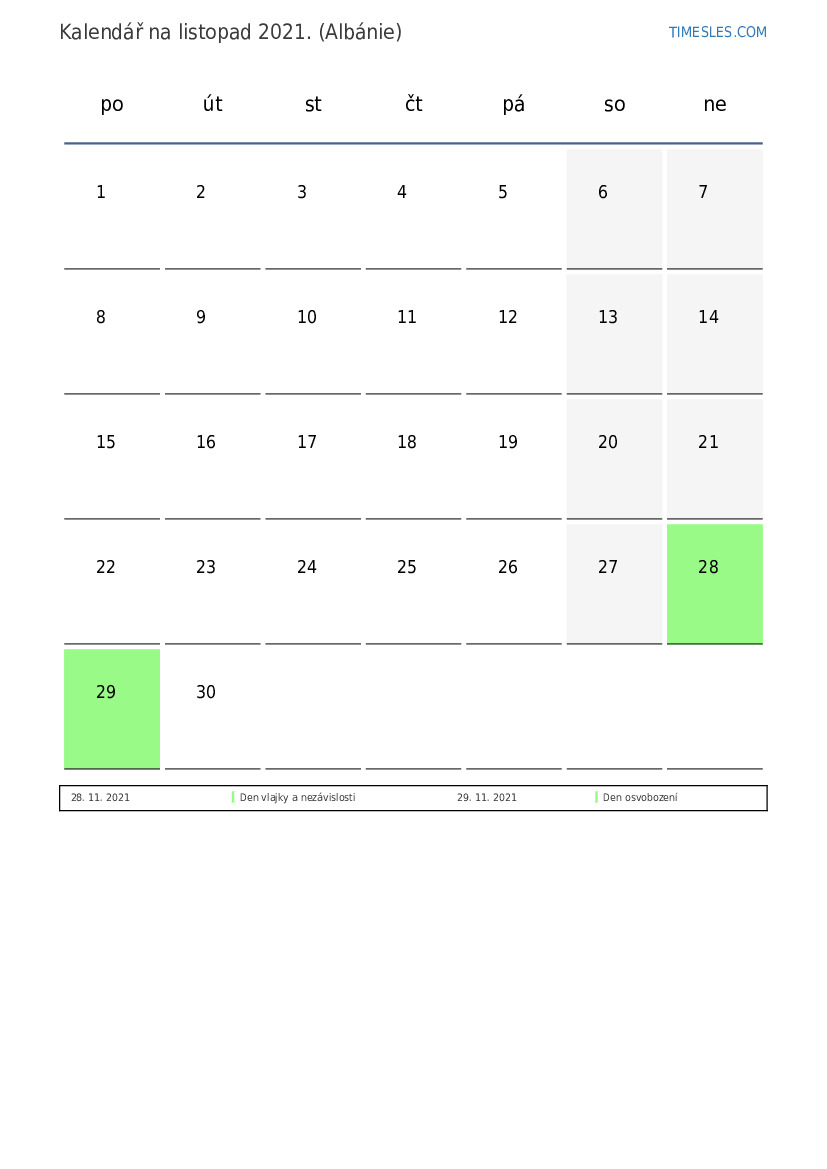 Stáhněte si a vytiskněte si kalendář PDF se svátky a víkendy na listopad 2021 pro Albánii