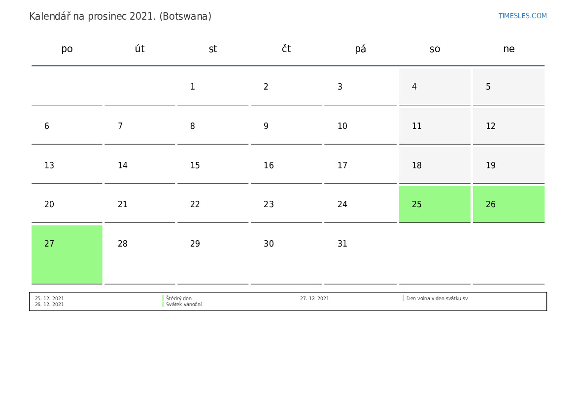 Stáhněte si a vytiskněte si kalendář PDF se svátky a víkendy na prosinec 2021 pro Botswanu