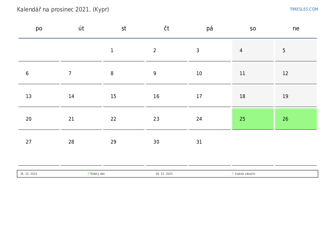 prosinec 2021 kalendář pro Kypr