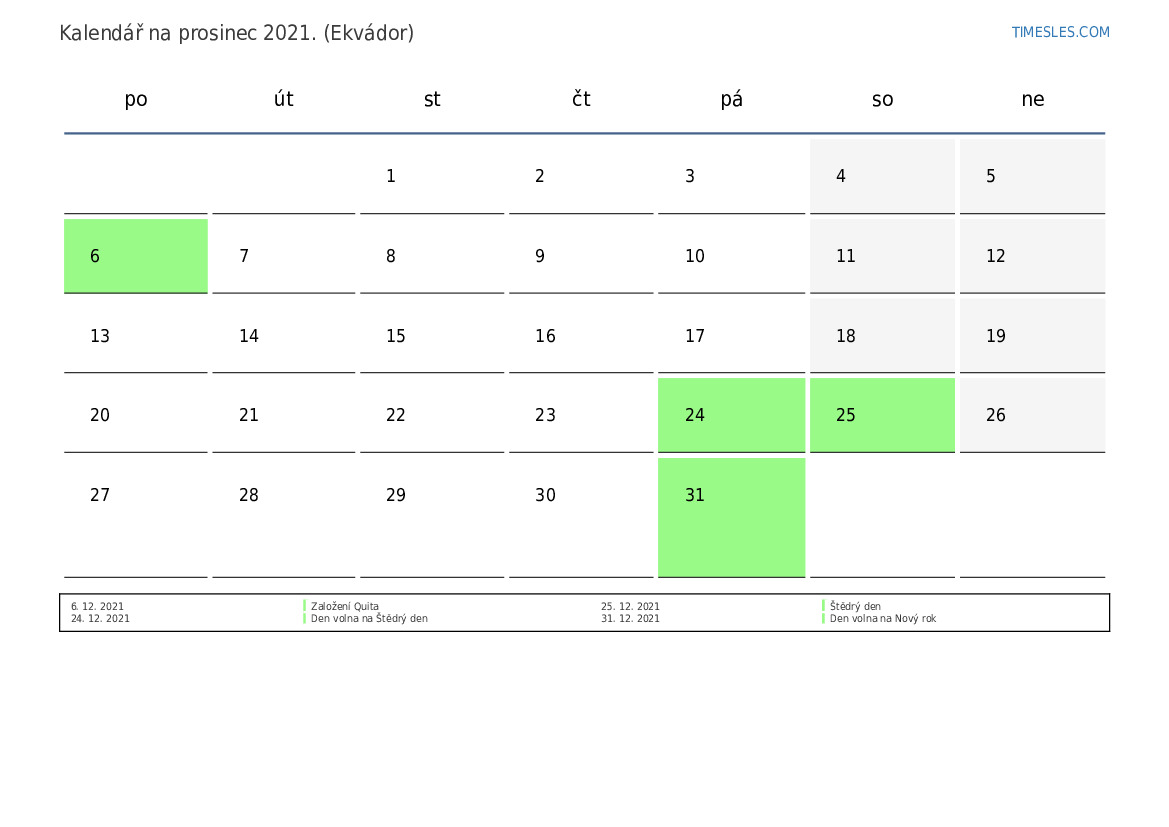 Kalendář svátků a víkendů na prosinec 2021 pro Ekvádor