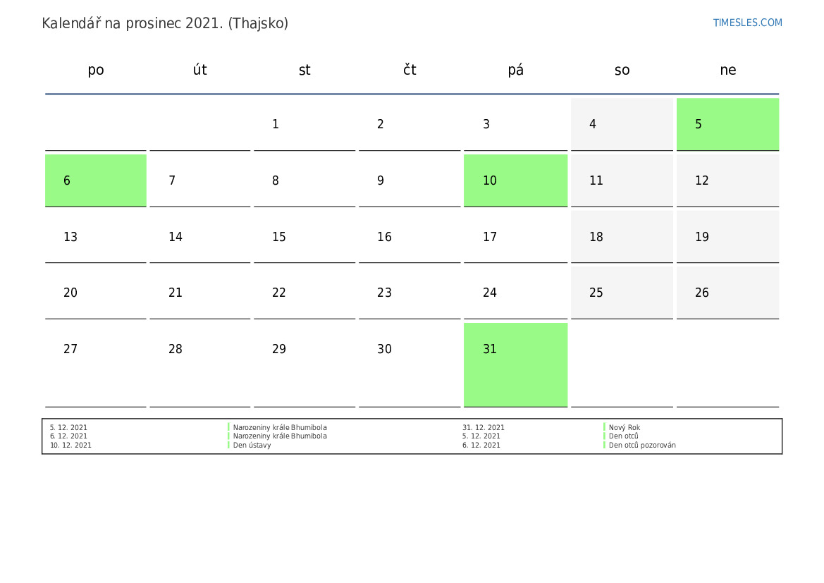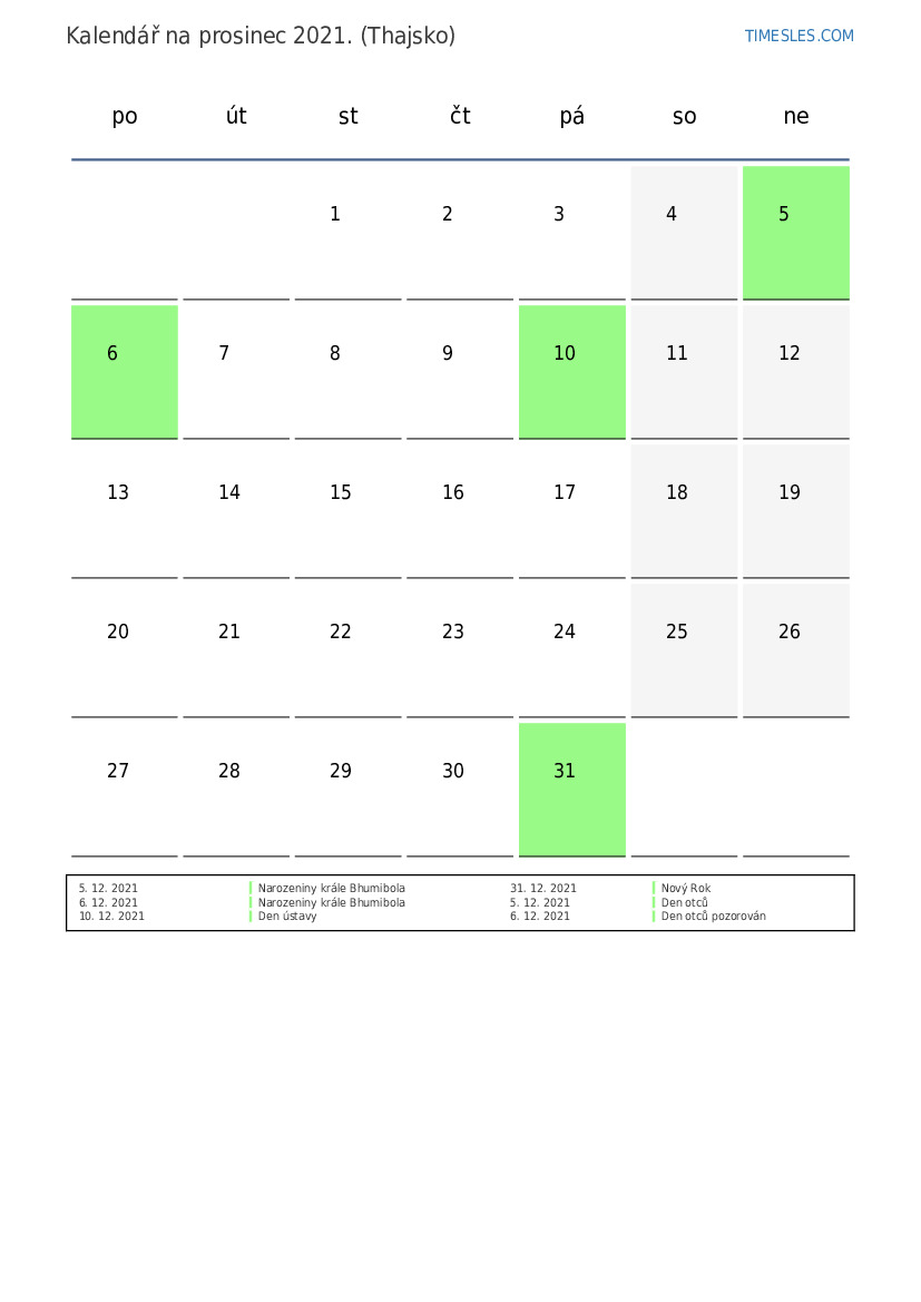 prosinec 2021 kalendář pro Thajsko