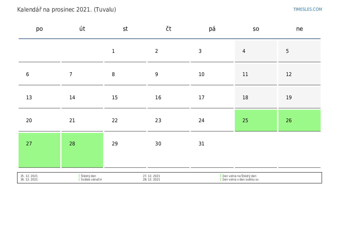 Stáhněte si a vytiskněte si kalendář PDF se svátky a víkendy na prosinec 2021 pro Tuvalu