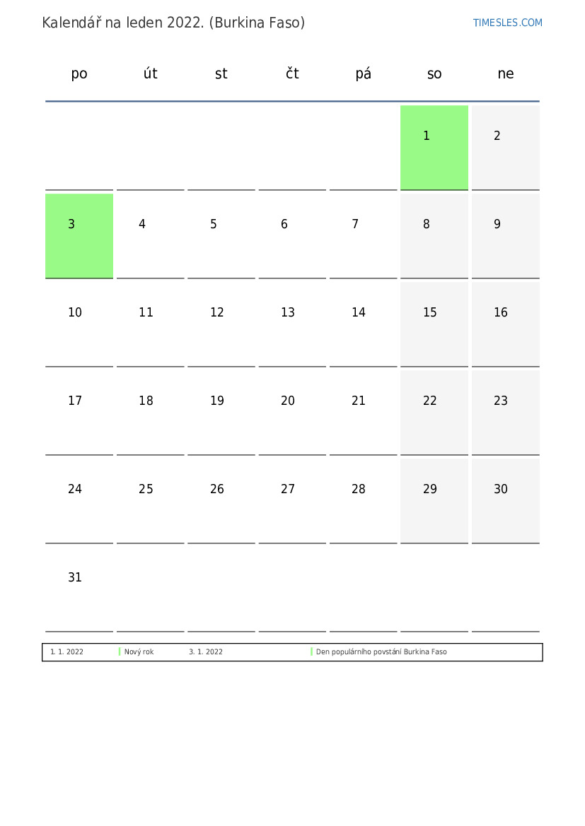 Kalendář svátků a víkendů na leden 2022 pro Burkinu Faso