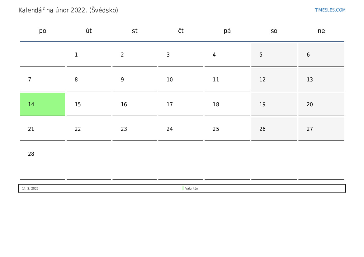 Stáhněte si a vytiskněte si kalendář PDF se svátky a víkendy na únor 2022 pro Švédsko