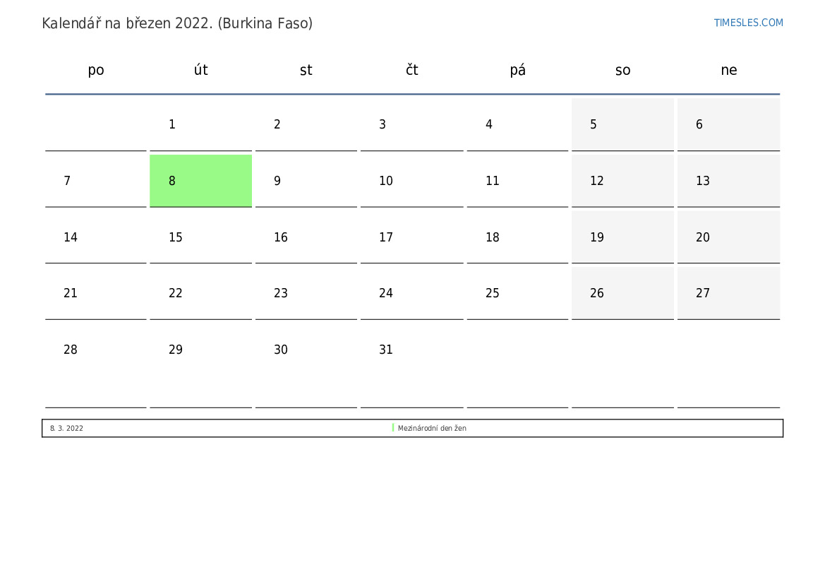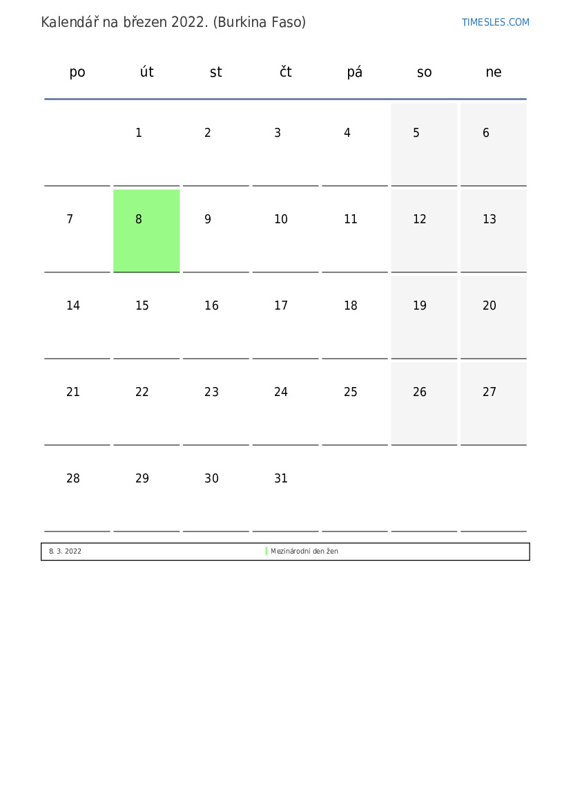 Stáhněte si a vytiskněte si kalendář PDF se svátky a víkendy na březen 2022 pro Burkinu Faso