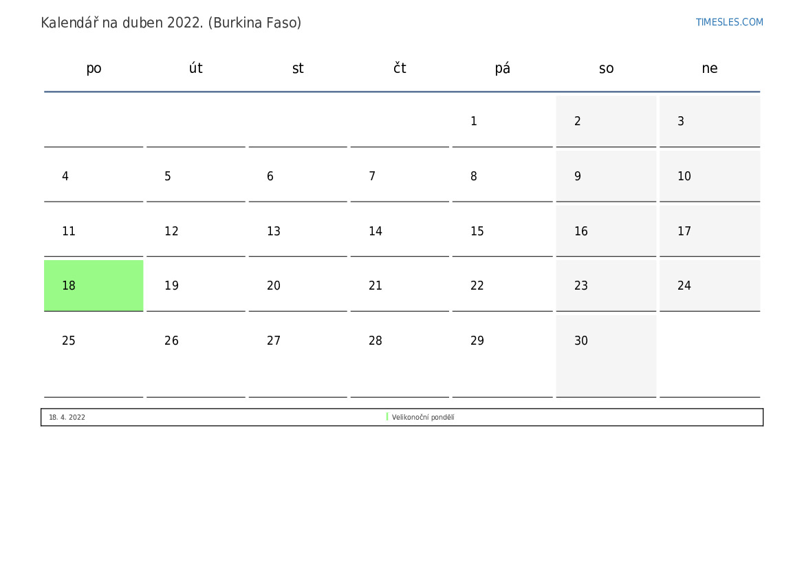 Stáhněte si a vytiskněte si kalendář PDF se svátky a víkendy na duben 2022 pro Burkinu Faso