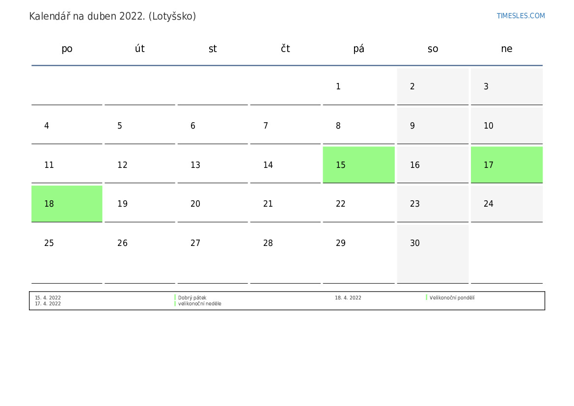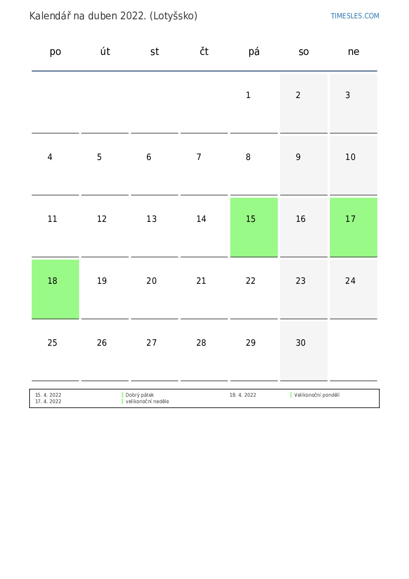Stáhněte si a vytiskněte si kalendář PDF se svátky a víkendy na duben 2022 pro Lotyšsko