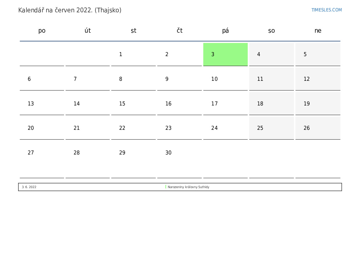 Stáhněte si a vytiskněte si kalendář PDF se svátky a víkendy na červen 2022 pro Thajsko