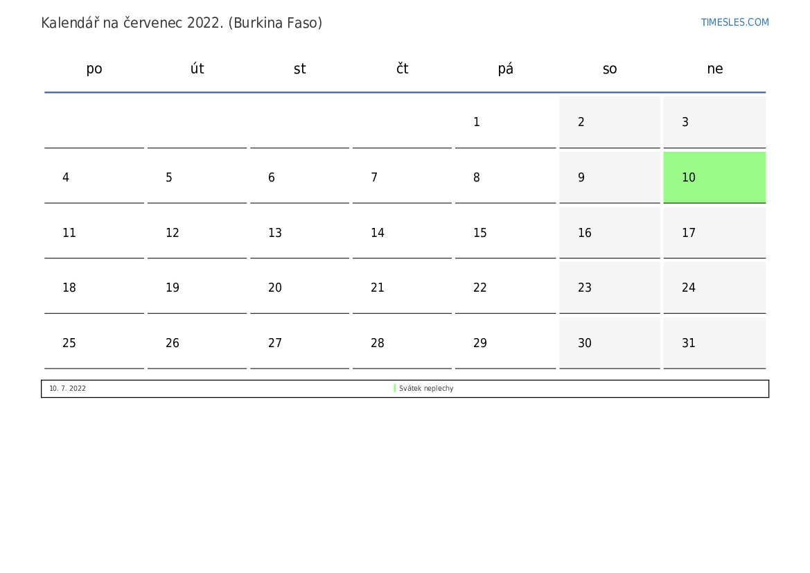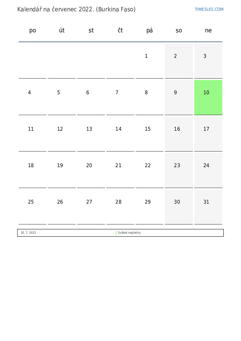 Stáhněte si a vytiskněte si kalendář PDF se svátky a víkendy na červenec 2022 pro Burkinu Faso