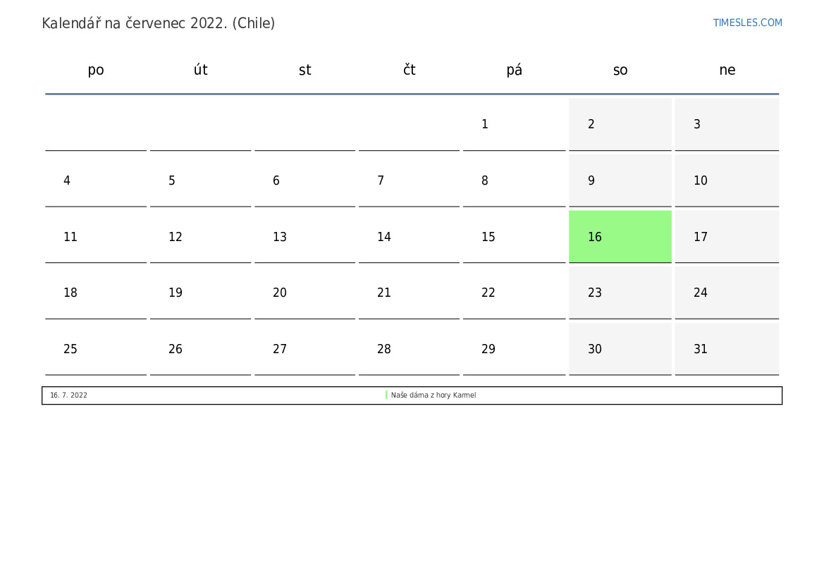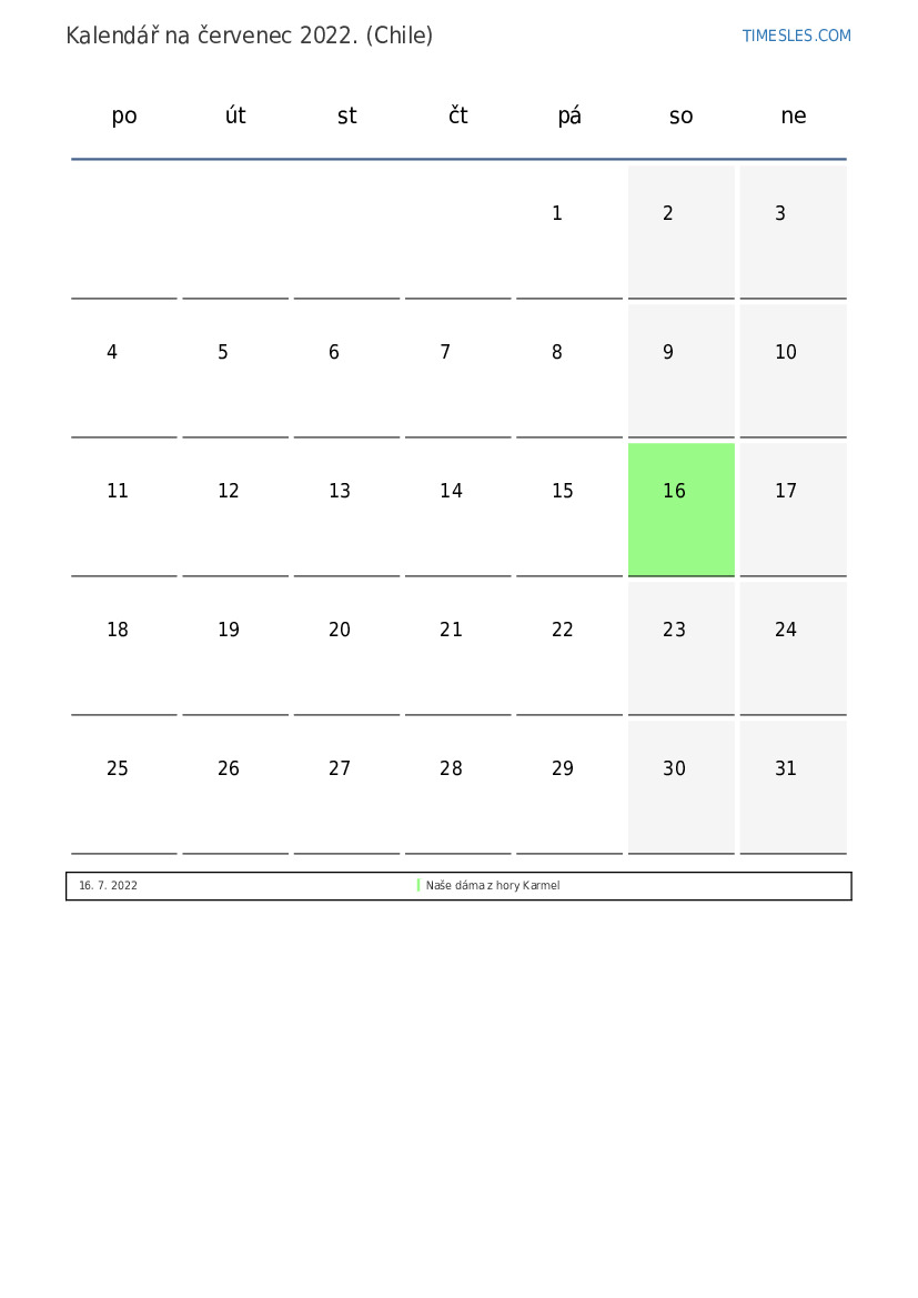 Stáhněte si a vytiskněte si kalendář PDF se svátky a víkendy na červenec 2022 pro Chile