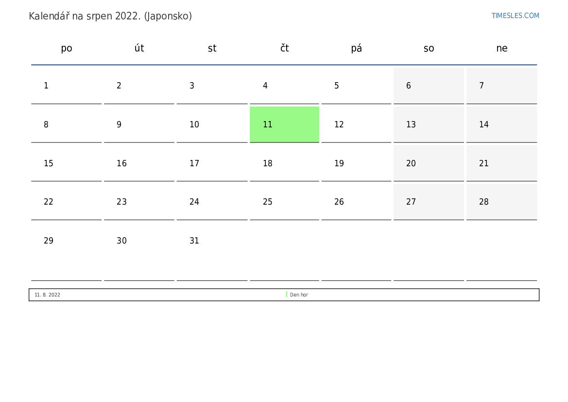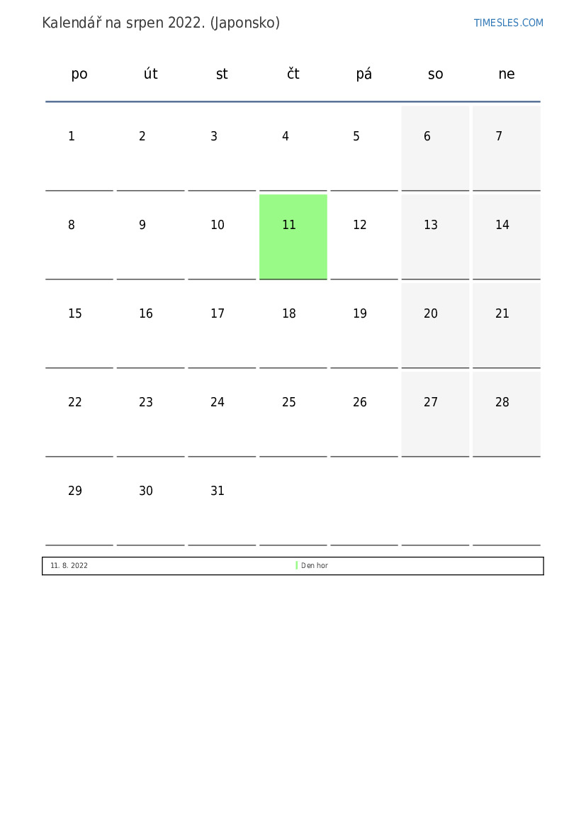 Stáhněte si a vytiskněte si kalendář PDF se svátky a víkendy na srpen 2022 pro Japonsko