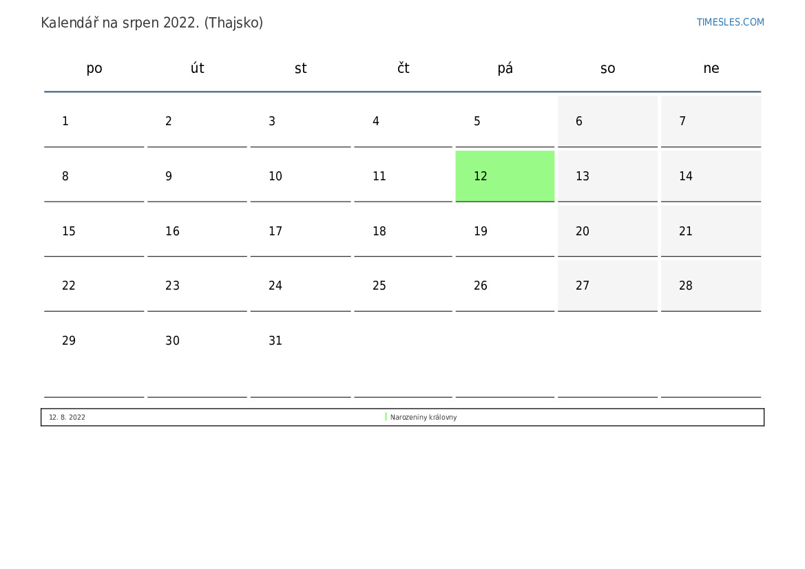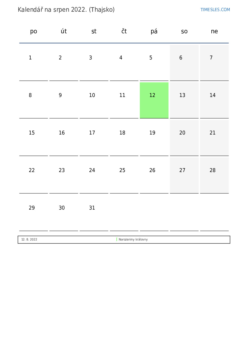 Stáhněte si a vytiskněte si kalendář PDF se svátky a víkendy na srpen 2022 pro Thajsko