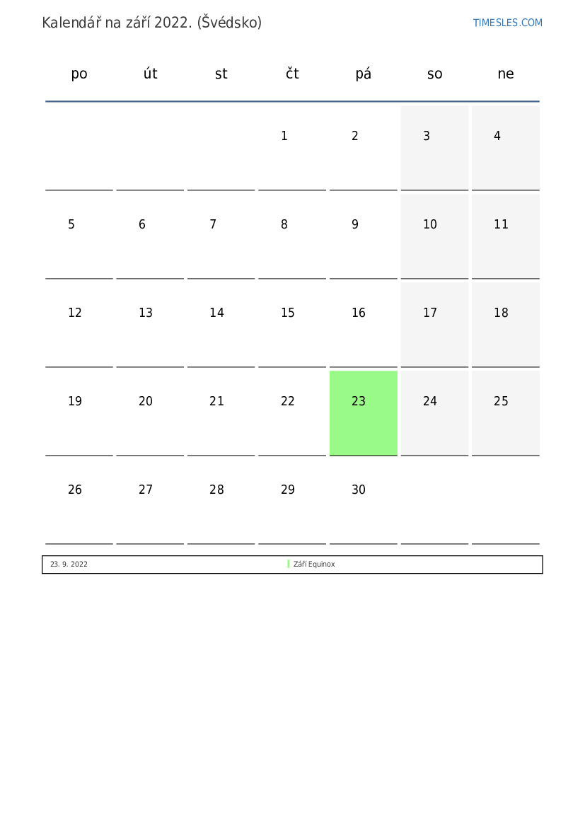 Stáhněte si a vytiskněte si kalendář PDF se svátky a víkendy na září 2022 pro Švédsko