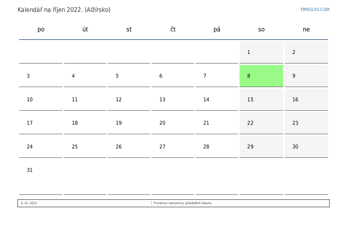 Měsíc říjen obsahuje 31 dnů. Toto je 10 měsíc roku 2022. Sezóna roku: podzim. Měsíc říjen začíná v sobotu a končí v Pondělí. V měsíci říjen 2022 je v Alžírsku 1 svátek a den volna.
