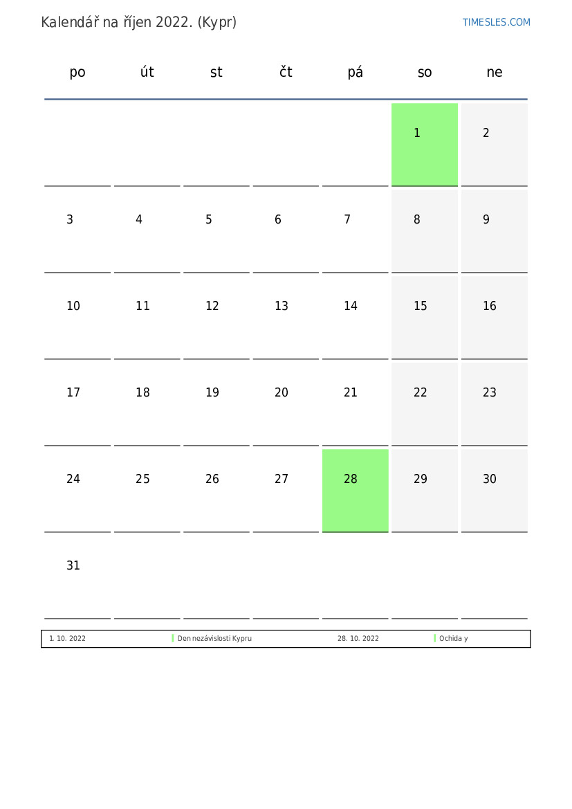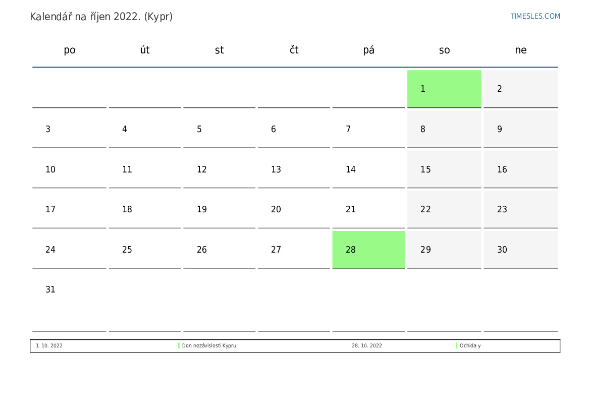 Stáhněte si a vytiskněte si kalendář PDF se svátky a víkendy na říjen 2022 pro Kypr