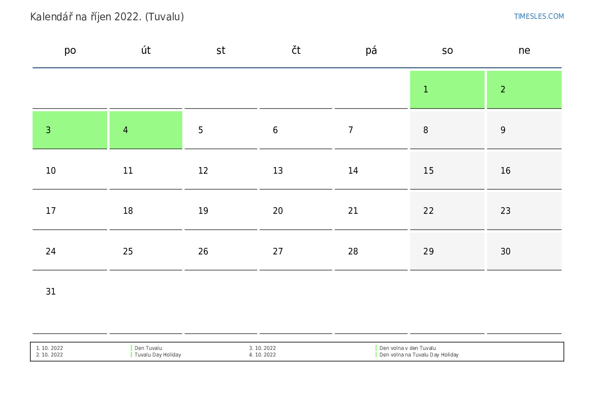 Stáhněte si a vytiskněte si kalendář PDF se svátky a víkendy na říjen 2022 pro Tuvalu