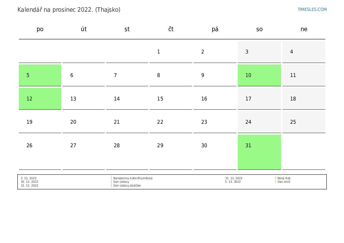 Stáhněte si a vytiskněte si kalendář PDF se svátky a víkendy na prosinec 2022 pro Thajsko