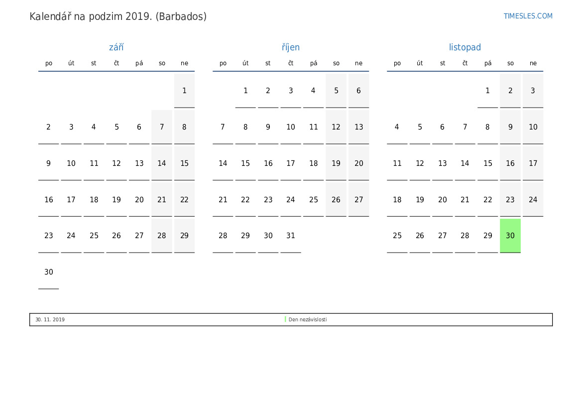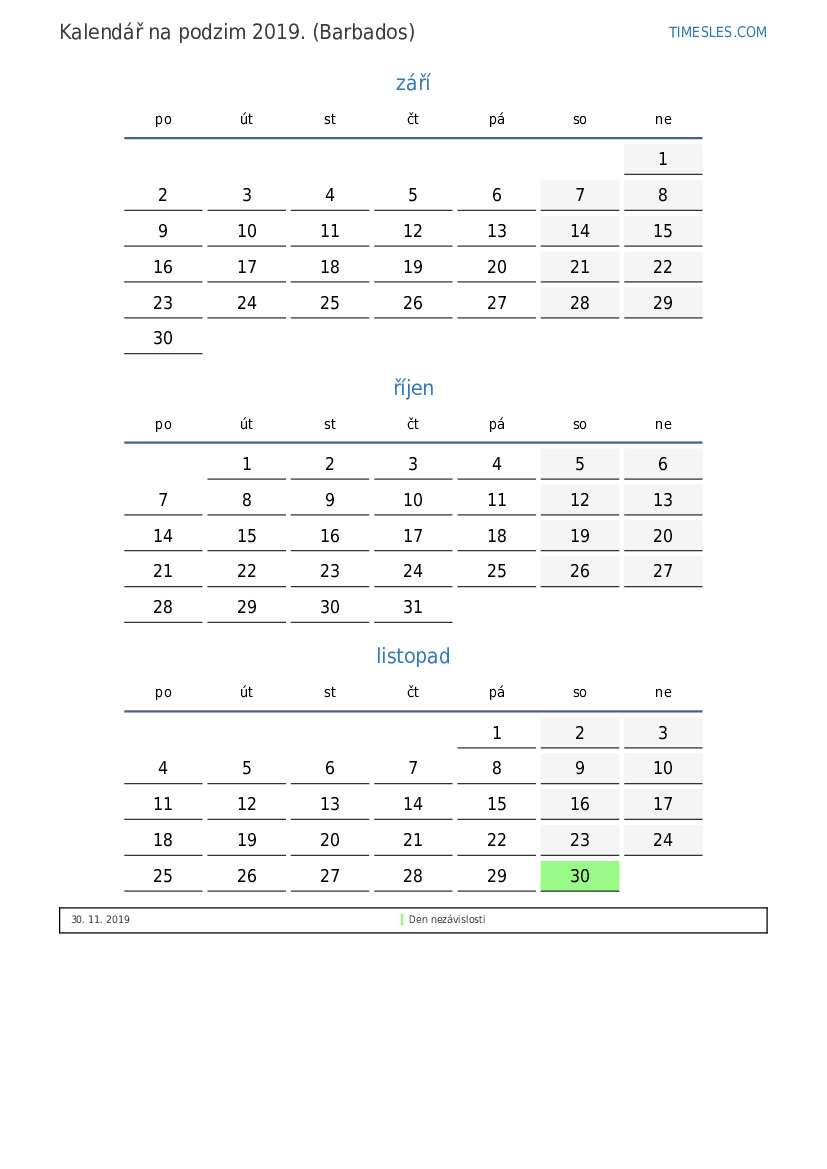 Stáhněte si a vytiskněte si kalendář PDF se svátky a víkendy na podzim 2019 pro Barbados