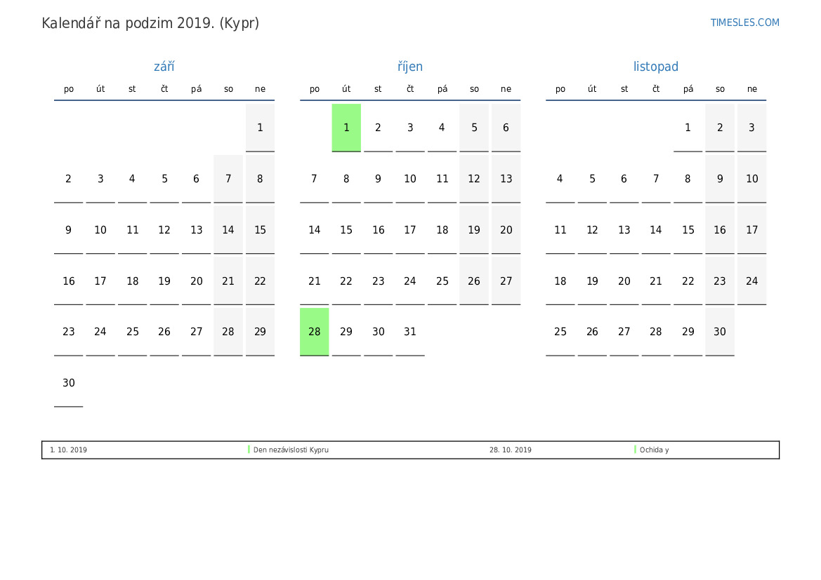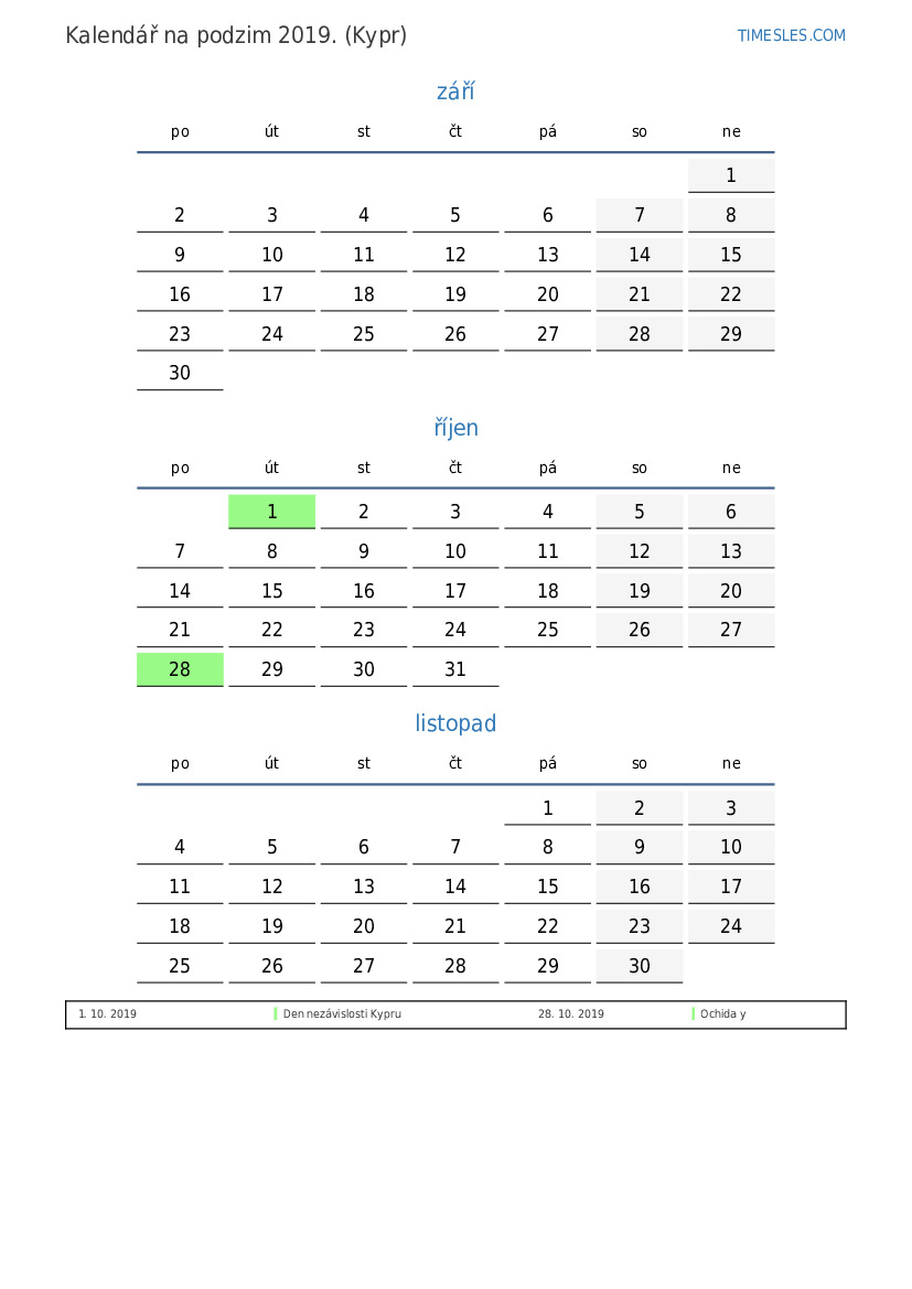 Stáhněte si a vytiskněte si kalendář PDF se svátky a víkendy na podzim 2019 pro Kypr