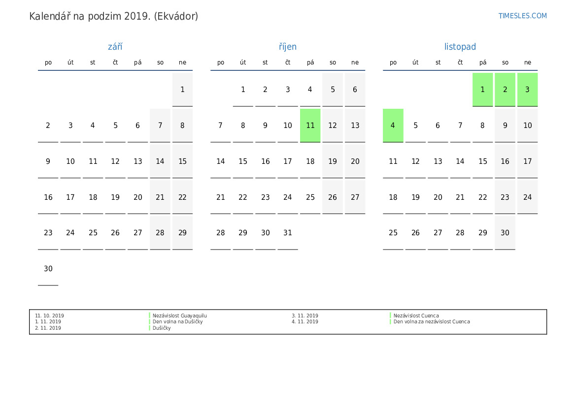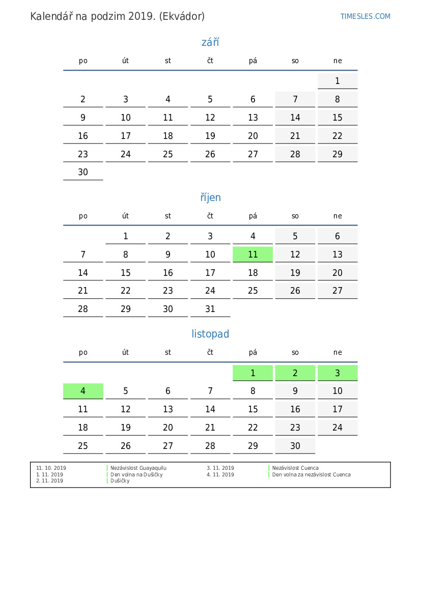 Stáhněte si a vytiskněte si kalendář PDF se svátky a víkendy na podzim 2019 pro Ekvádor