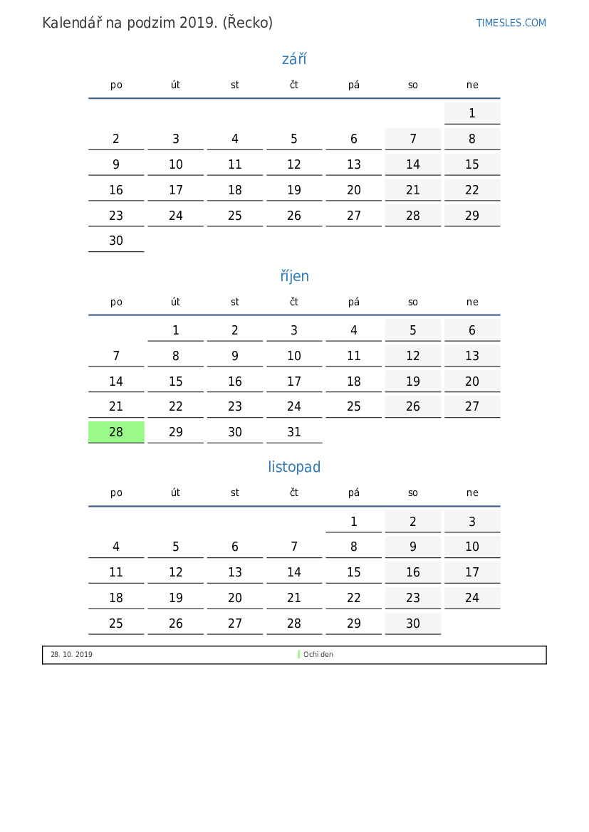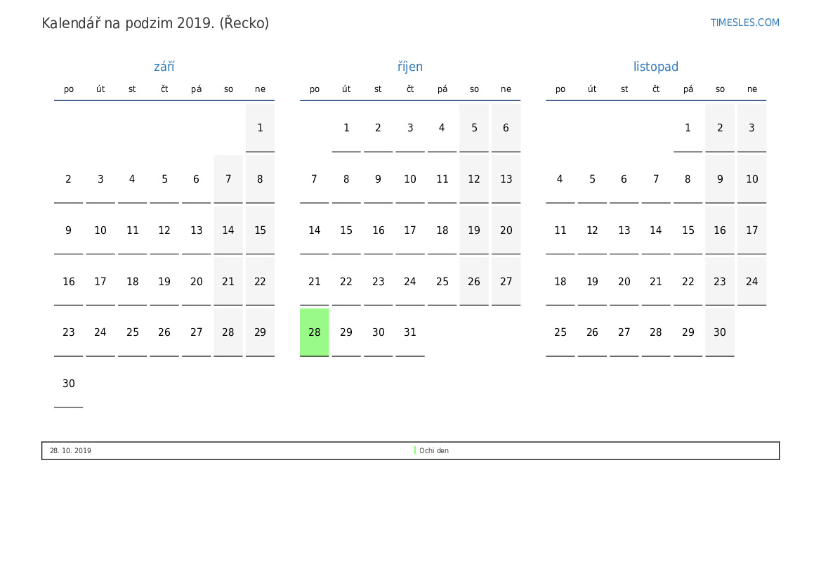 Stáhněte si a vytiskněte si kalendář PDF se svátky a víkendy na podzim 2019 pro Řecko
