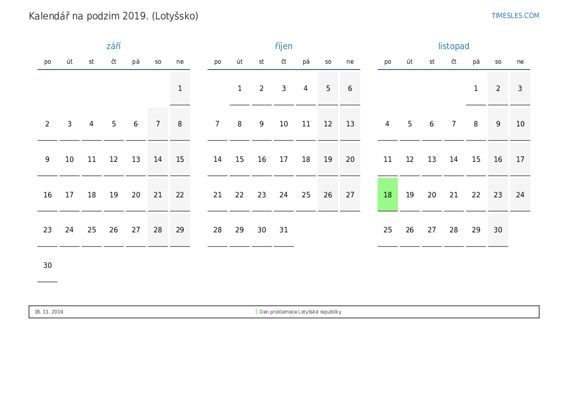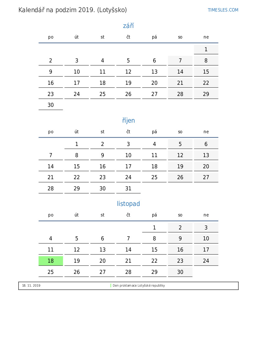 Na podzim roku 2019 je v Lotyšsku 5 svátky a dny volna. Podzim 2019 začíná v neděli a končí v sobotu.