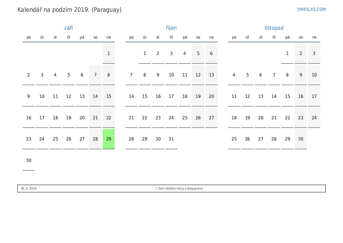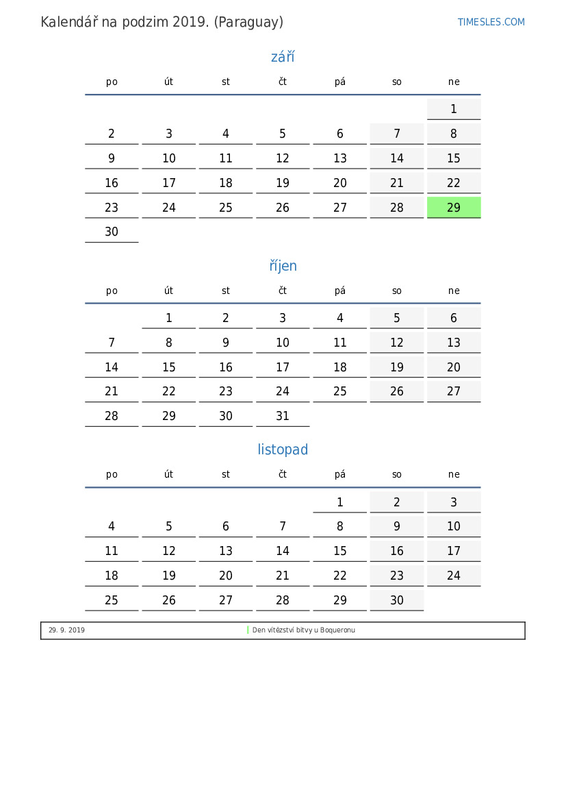 Stáhněte si a vytiskněte si kalendář PDF se svátky a víkendy na podzim 2019 pro Paraguay