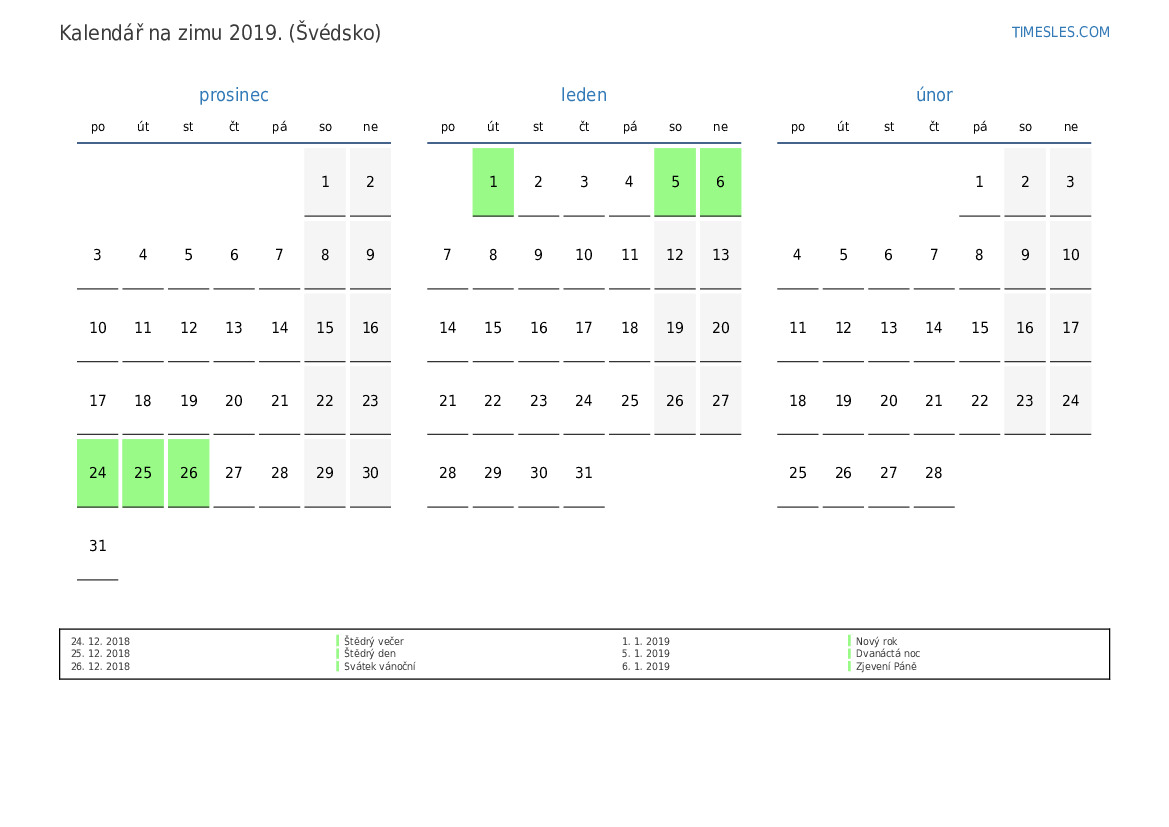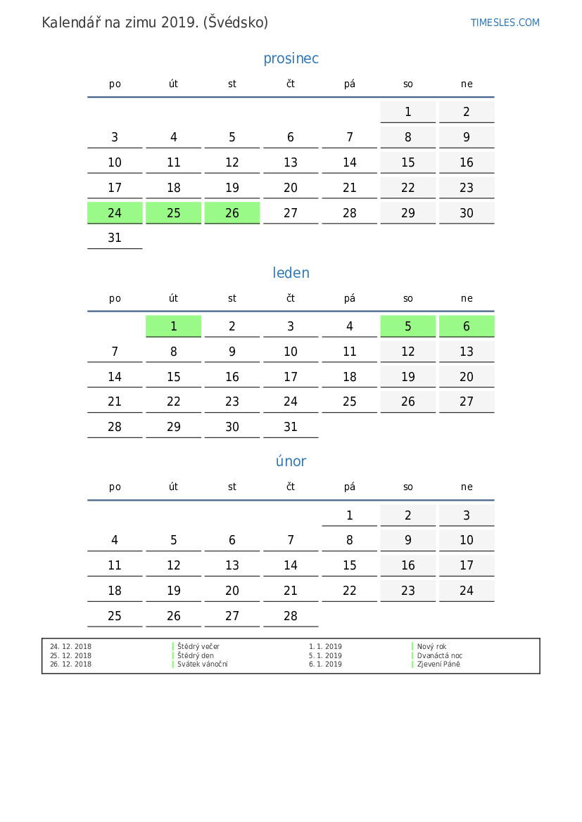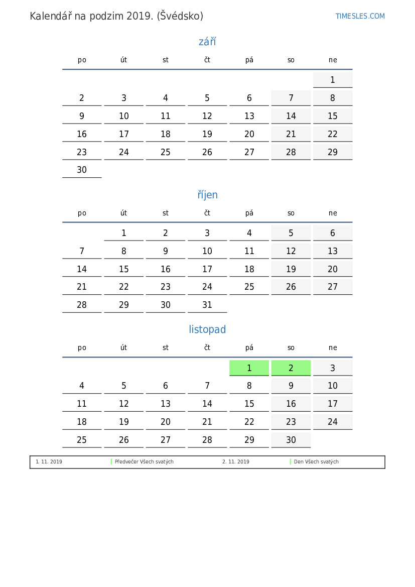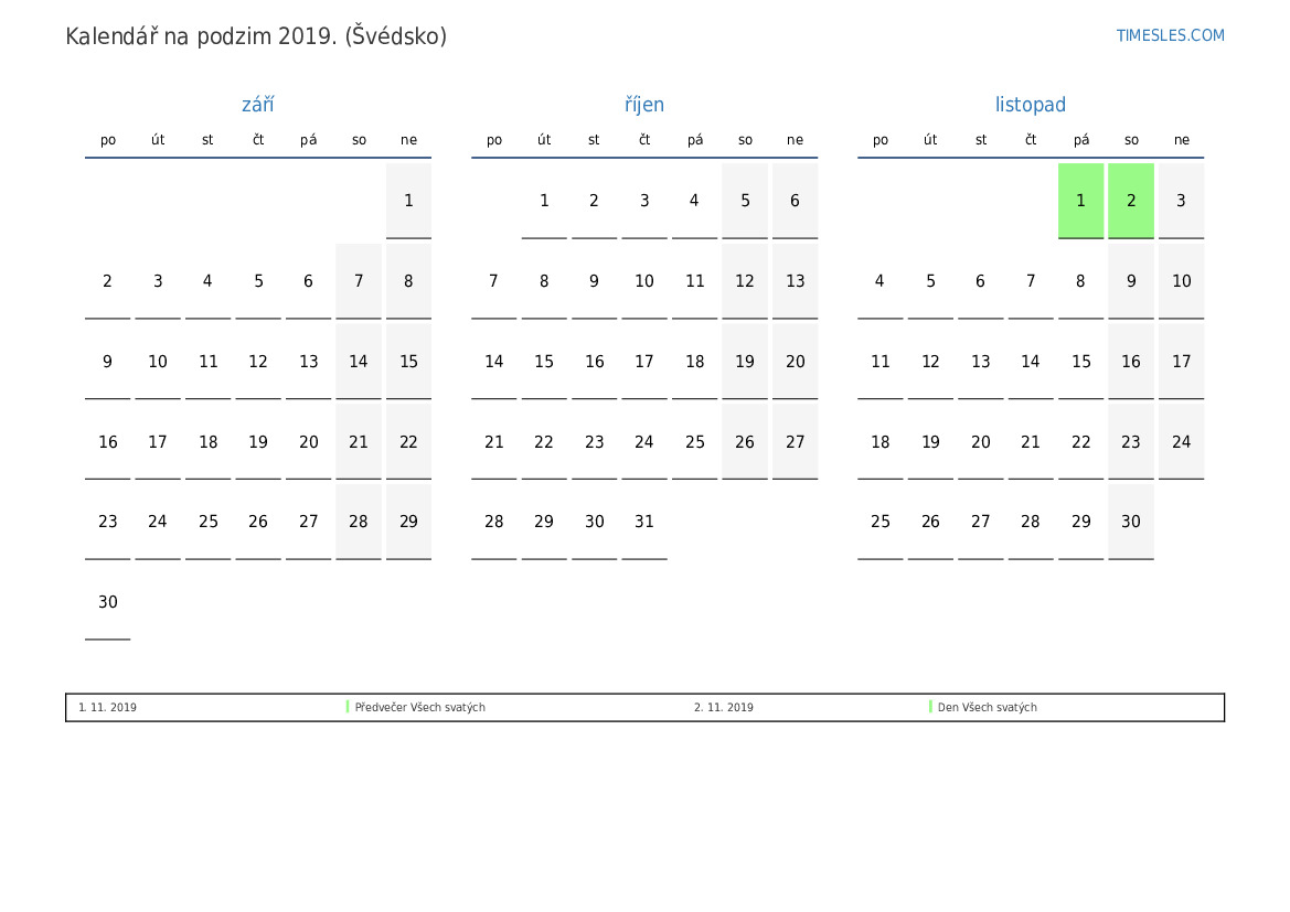 Stáhněte si a vytiskněte si kalendář PDF se svátky a víkendy na podzim 2019 pro Švédsko