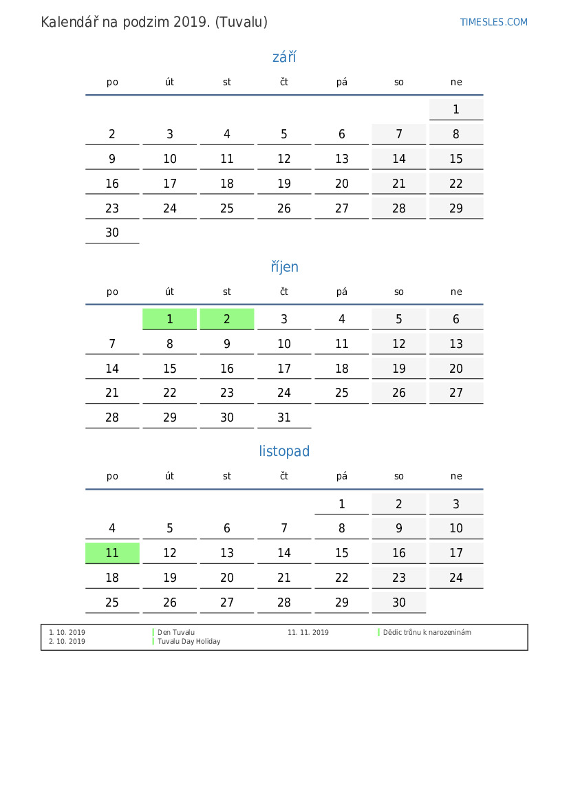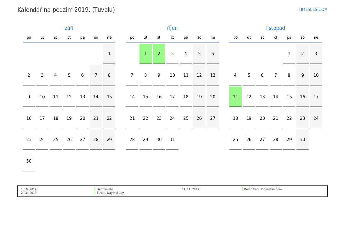 Stáhněte si a vytiskněte si kalendář PDF se svátky a víkendy na podzim 2019 pro Tuvalu