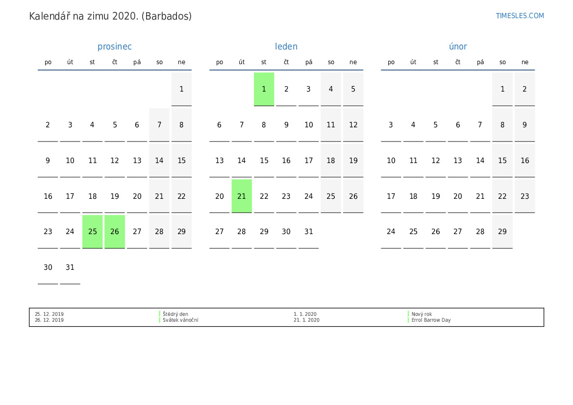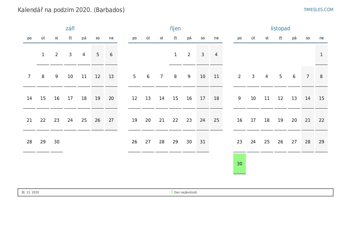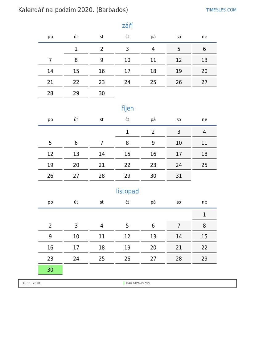 Stáhněte si a vytiskněte si kalendář PDF se svátky a víkendy na podzim 2020 pro Barbados