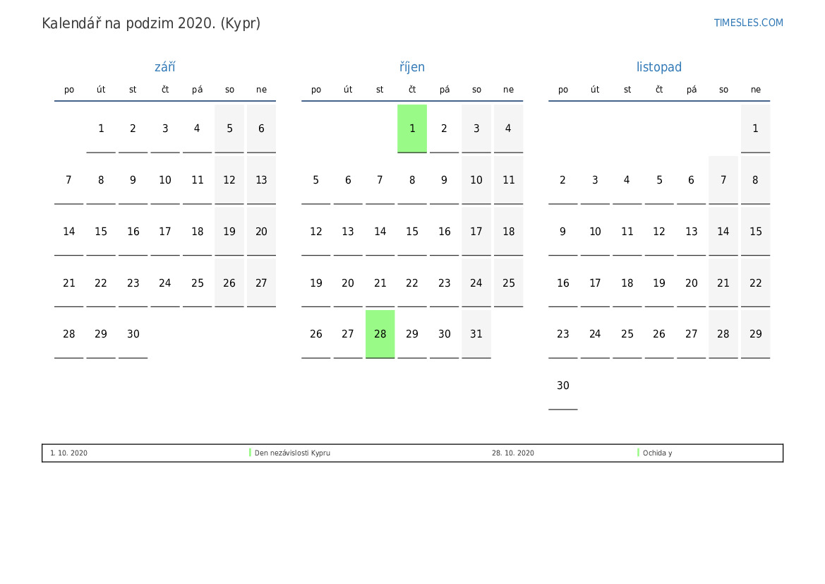 Stáhněte si a vytiskněte si kalendář PDF se svátky a víkendy na podzim 2020 pro Kypr