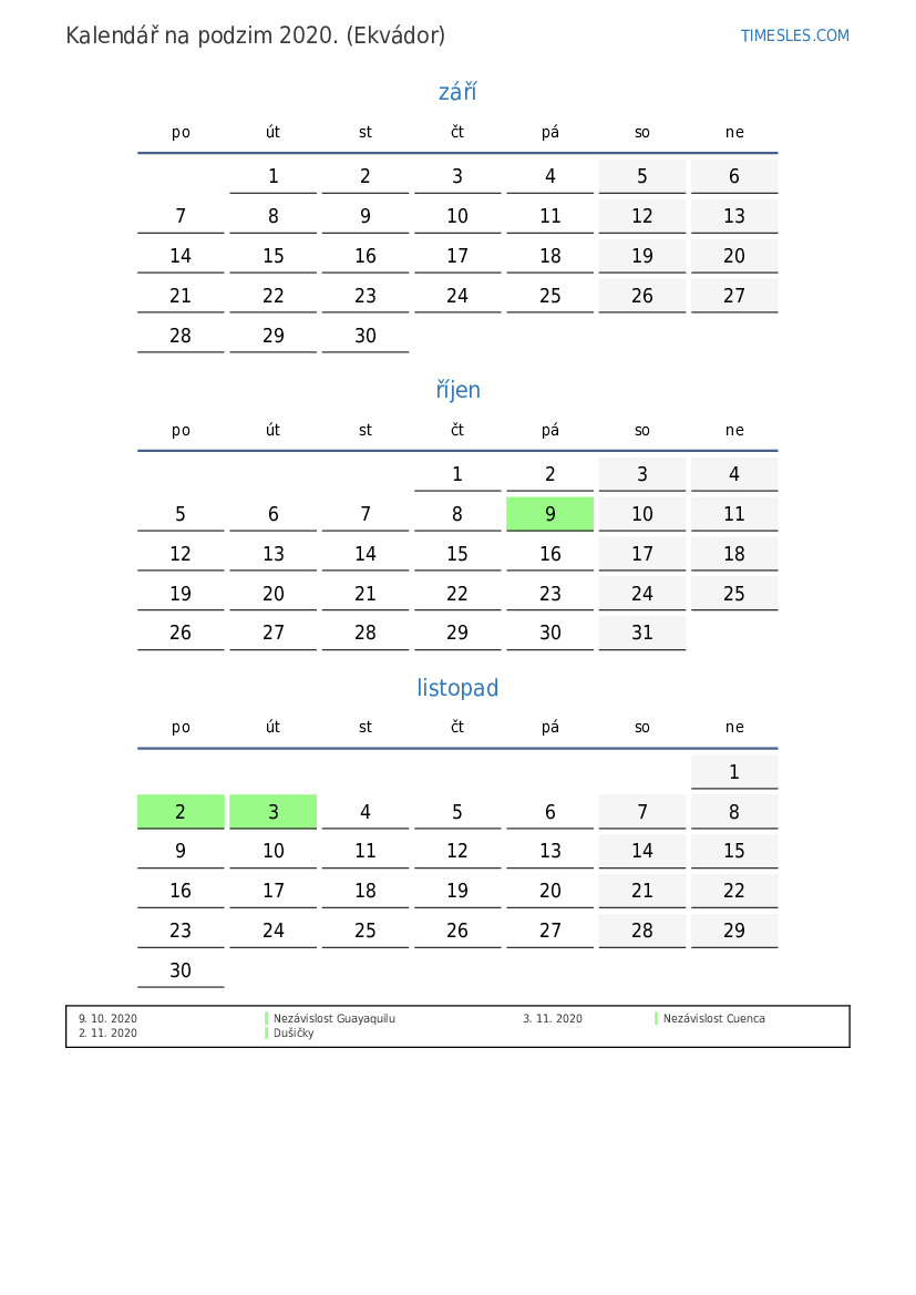 Kalendář svátků a víkendů na podzim 2020 pro Ekvádor
