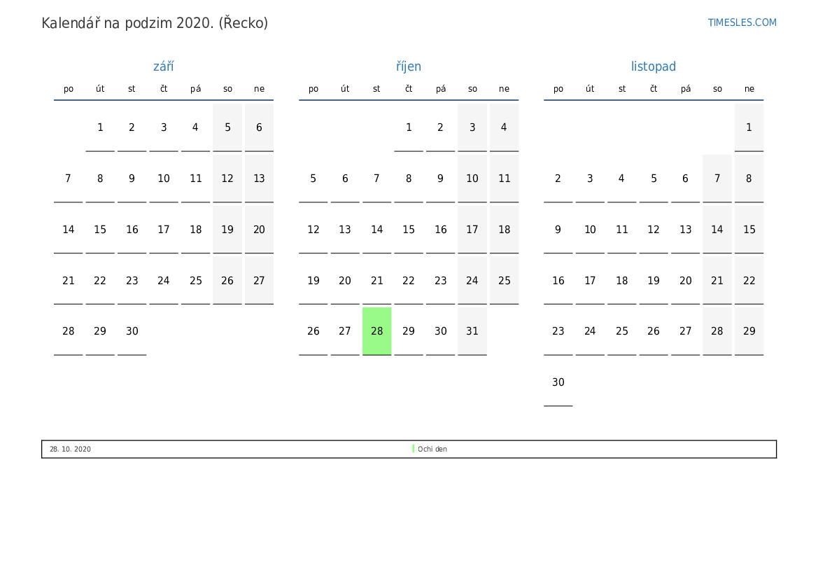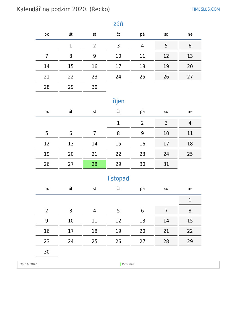 Stáhněte si a vytiskněte si kalendář PDF se svátky a víkendy na podzim 2020 pro Řecko