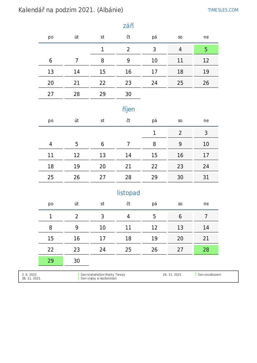 Kalendář na podzim 2021 pro Albánii