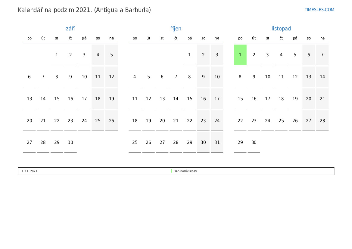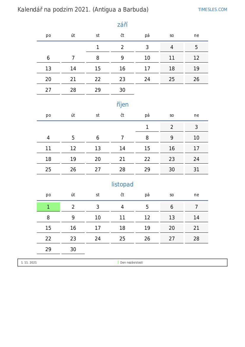 Stáhněte si a vytiskněte si kalendář PDF se svátky a víkendy na podzim 2021 pro Antiguu a Barbudu
