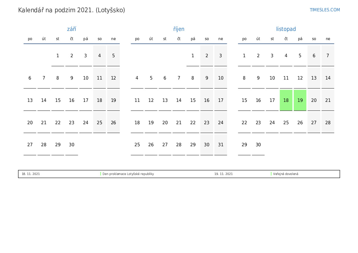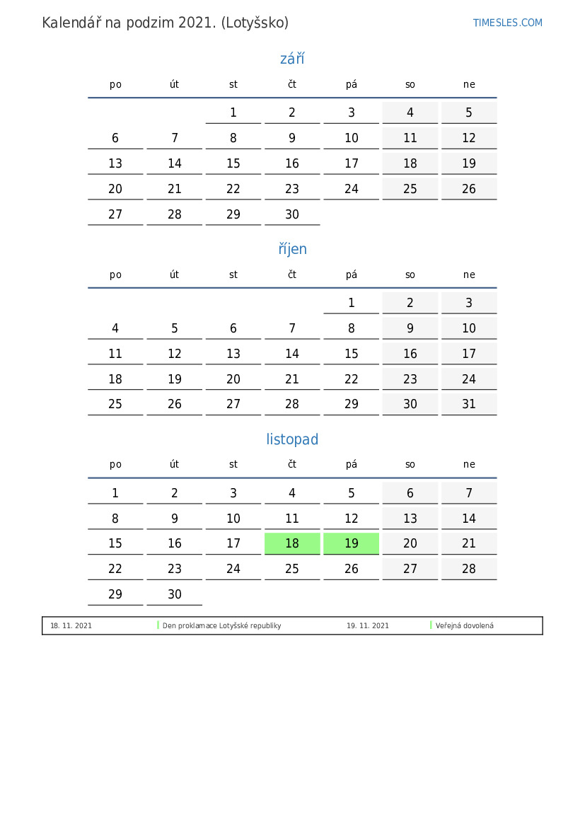 Stáhněte si a vytiskněte si kalendář PDF se svátky a víkendy na podzim 2021 pro Lotyšsko