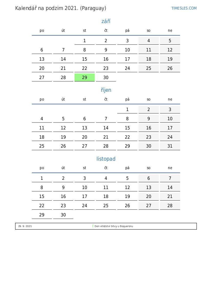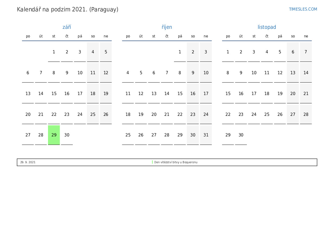 Stáhněte si a vytiskněte si kalendář PDF se svátky a víkendy na podzim 2021 pro Paraguay
