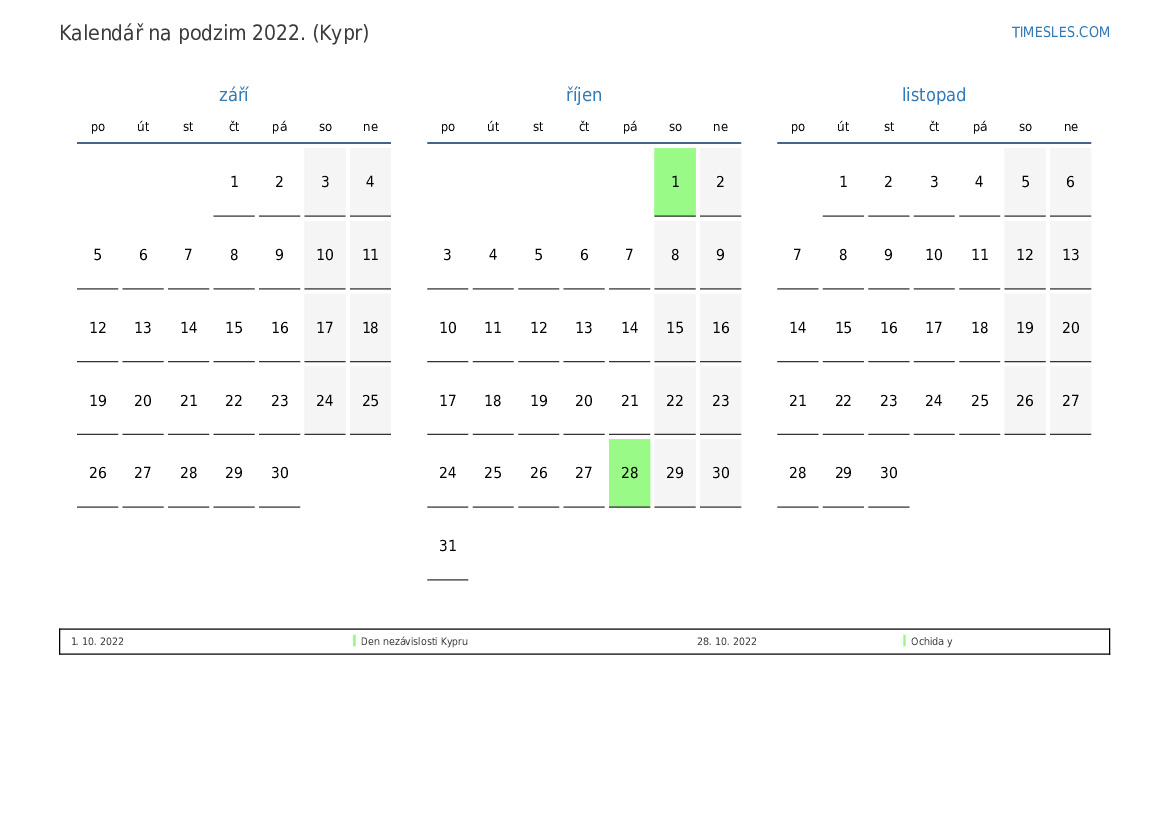 Stáhněte si a vytiskněte si kalendář PDF se svátky a víkendy na podzim 2022 pro Kypr