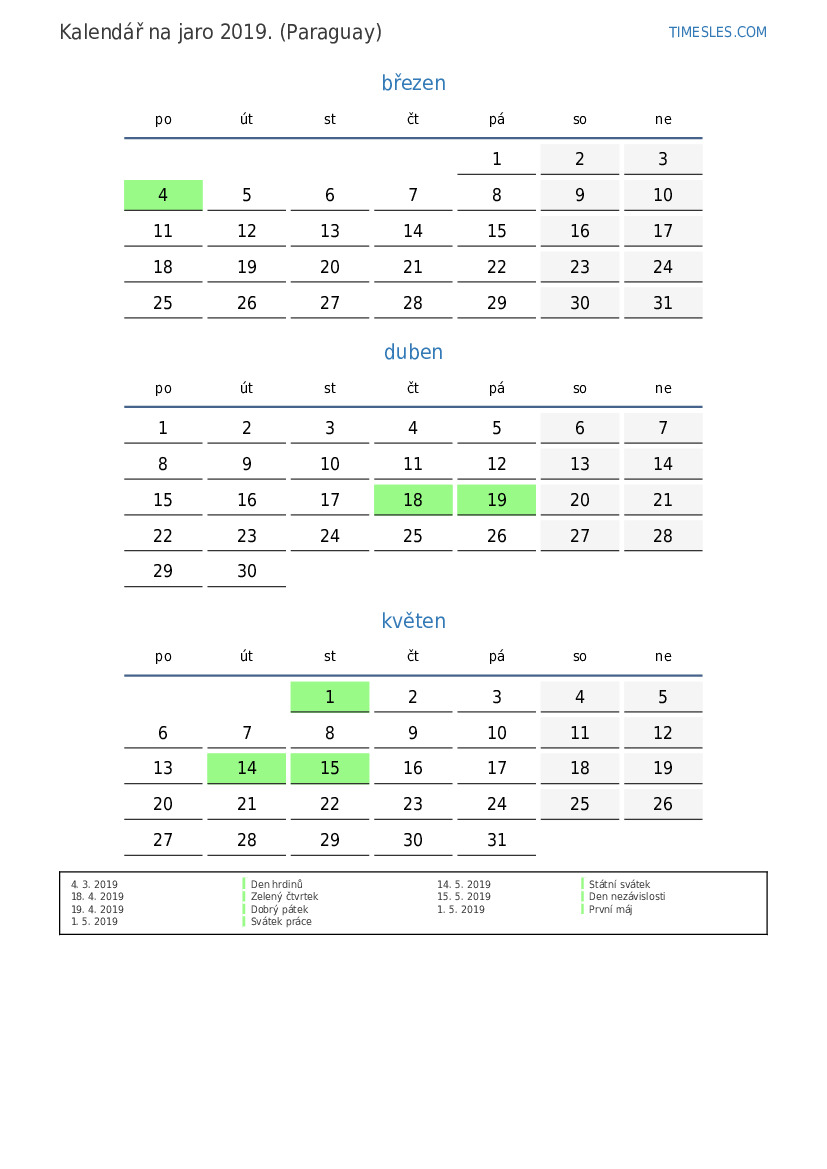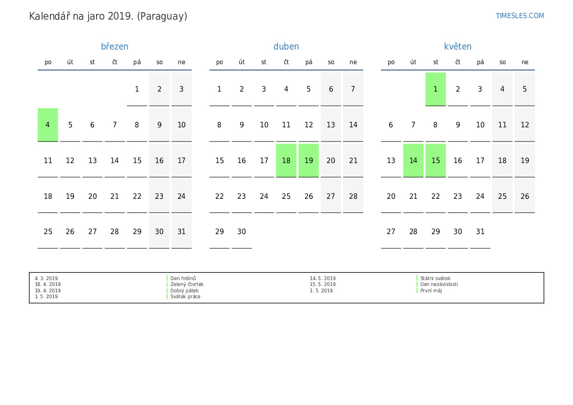 Stáhněte si a vytiskněte si kalendář PDF se svátky a víkendy na jaro 2019 pro Paraguay