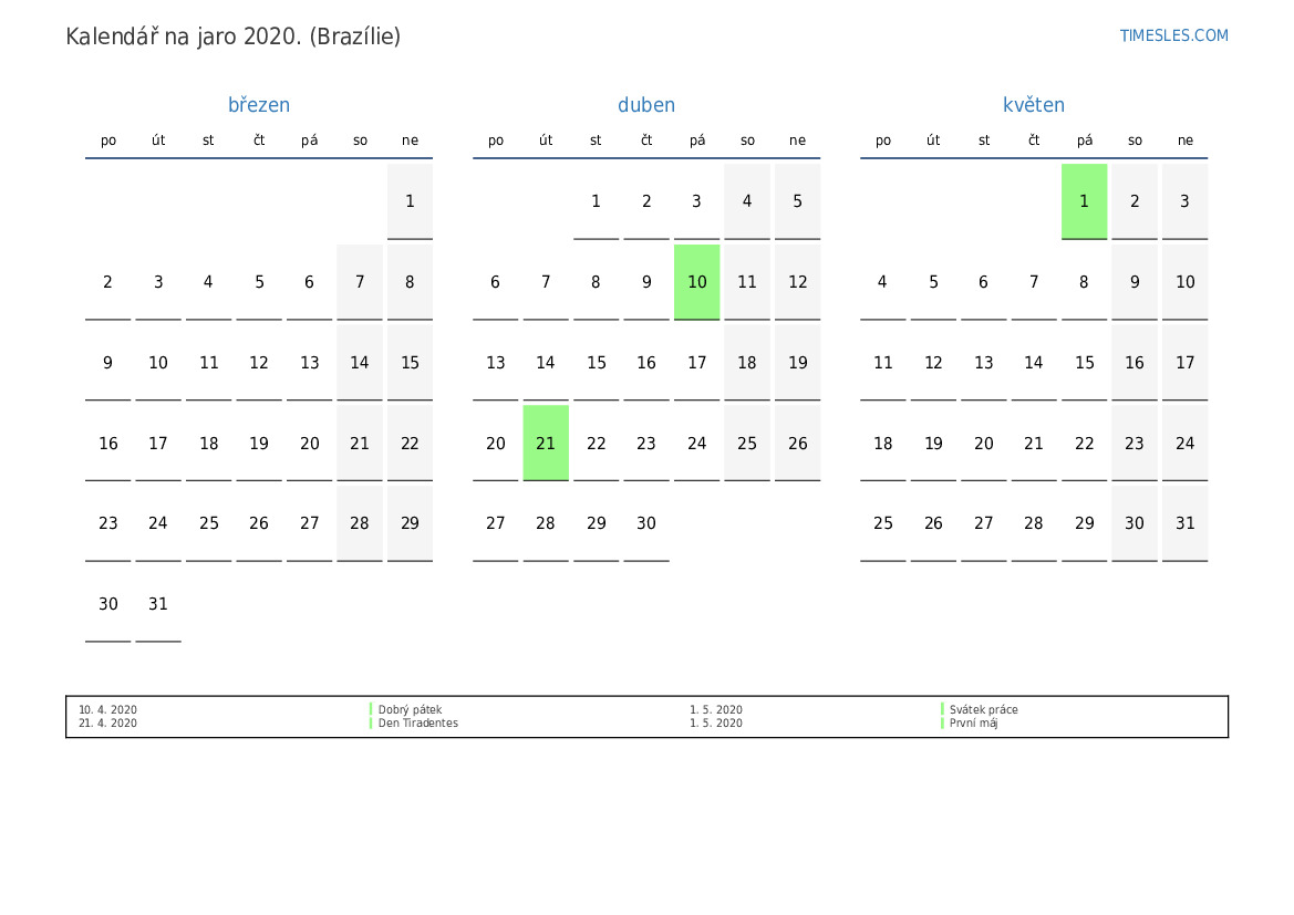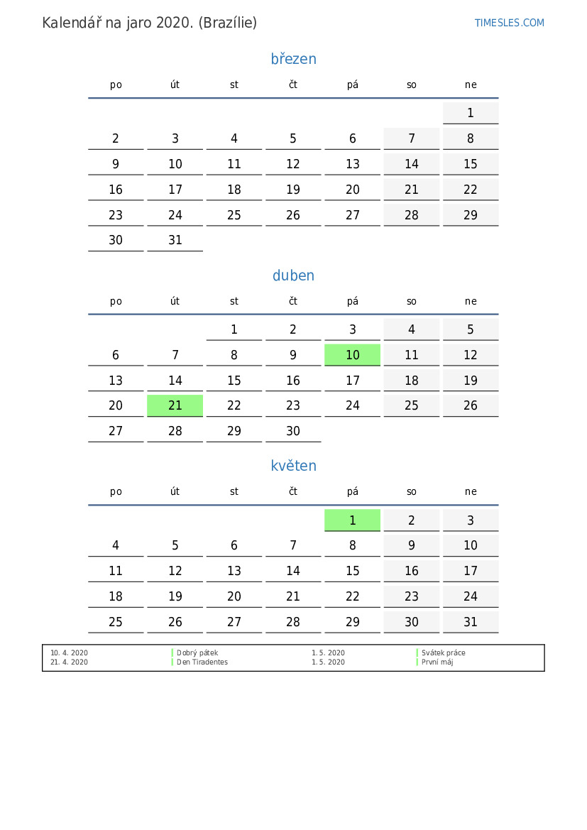 Stáhněte si a vytiskněte si kalendář PDF se svátky a víkendy na jaro 2020 pro Brazílii
